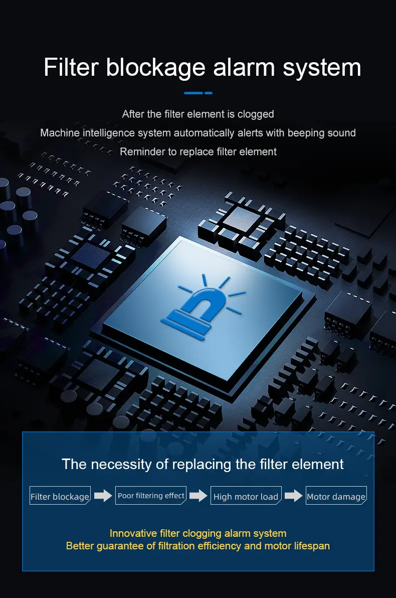 - The alarm activates once the machine detects reduced power and speed, indicating it’s time to change the filter.